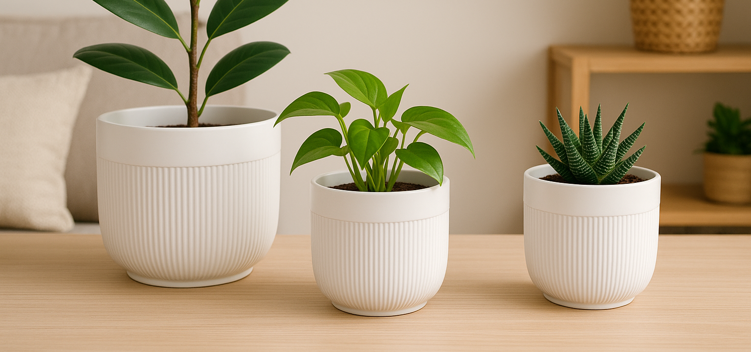 3-Piece White Stoneware Planter Set with Fluted Design